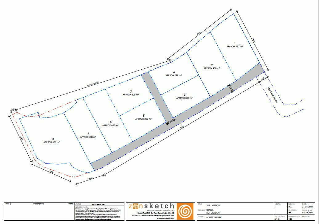 Berikut adalah pembagian ke dalam bidang yang direncanakan untuk tanah tersebut, tetapi pembeli pertama akan dapat memilih bidang yang lebih besar atau lebih kecil. Plot 6,7,8 dan 9 sudah terjual.